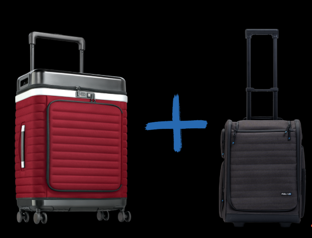 Pull Up Suitcase in red with front flap open and internal pull-up shelf system visible Pull Up Case blue, mechanism with vertically extended internal shelves shown fully deployed